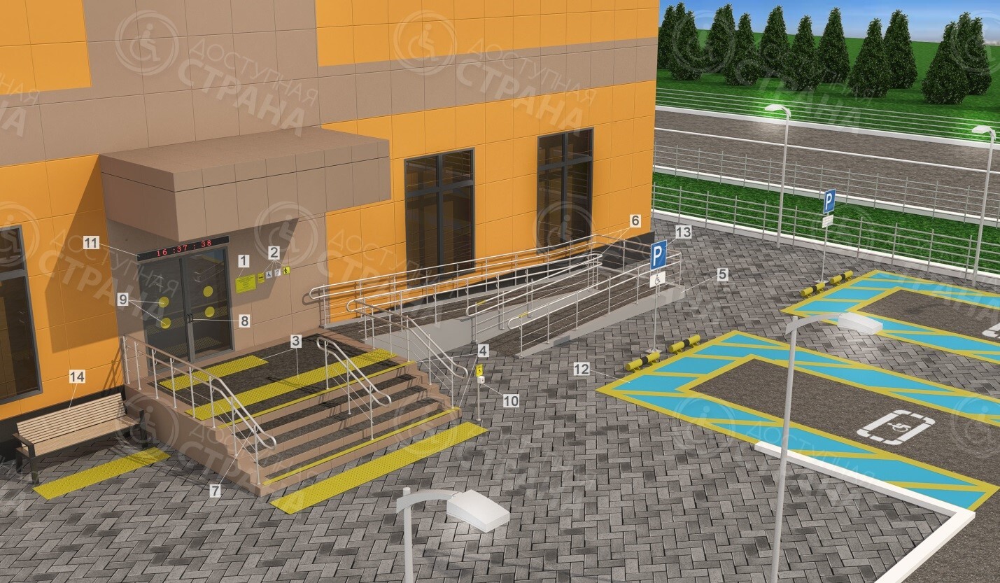 Пример реализации требований доступной среды: пандус со сходнями и двойными поручнями на входе в общественное здание и другое оборудование. Такие конструкции должны соответствовать уклону, ширине и другим параметрам по СП 59.13330 и ГОСТ Р 51261 // dostupnaya-strana.ru